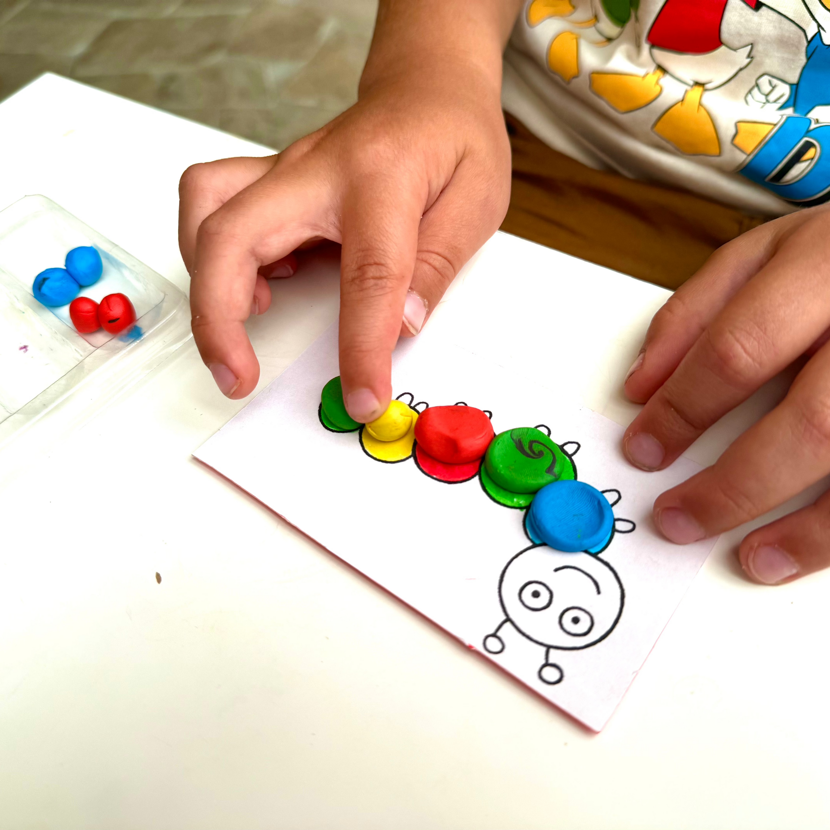 Этот увлекательный набор карточек с гусеницами включает творческие материалы – пластилин, мягкие бусины и плоские кружки, помогая детям развивать воображение, креативное мышление и мелкую моторику.